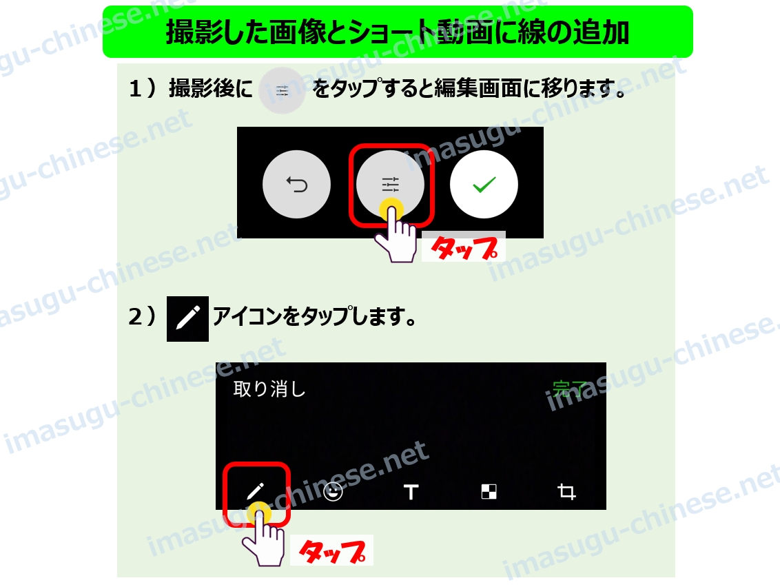画像とショート動画に好きにペン機能で書き込みを行えます。