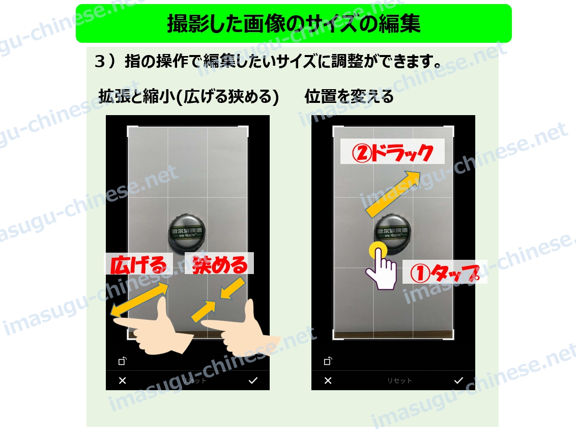 撮影した画像を拡大して必要な部分を切り抜いて画像を送りたい、縦向きの画像を横向きに置き換えて画像を送りたい、撮影した画像を編集して送信する機能をご紹介します。