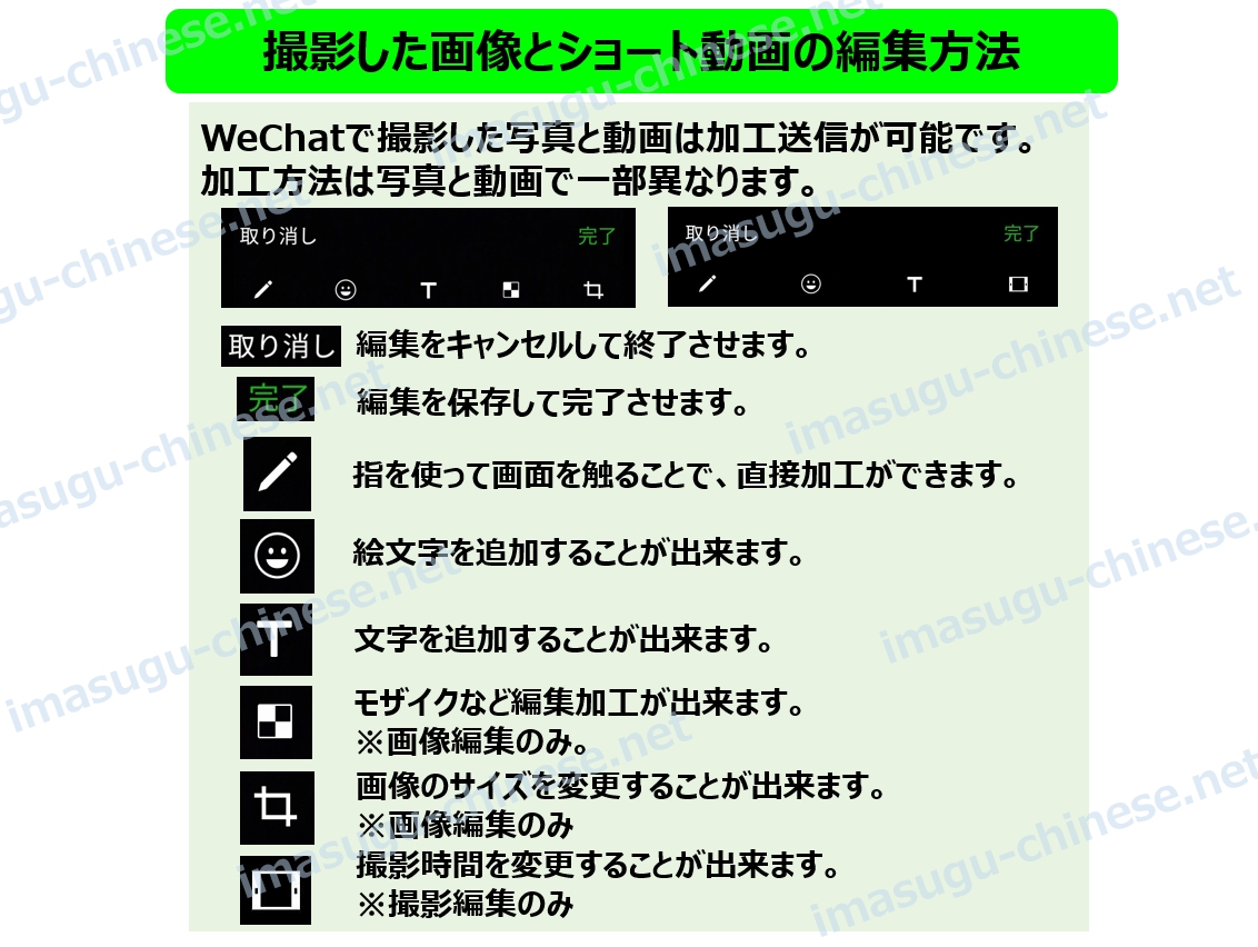 スマートフォンのカメラで撮影して、WeChatを起動してアルバムから選択する必要がなく、素早く相手に画像を送れます。またWeChatカメラで撮影した画像や動画は文字やステッカーを追加して相手に送信することも可能です。
