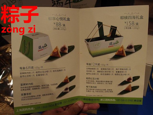 端午節のキャンペーンとして、二種類のチマキをセットで販売。お値段は6個入り88元、12個入り158元。八を絡めて値段を付けるあたり、中国チック。