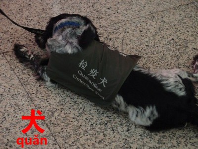 着せられた服の背中には「检疫犬(jiǎn yì quǎn)」の文字