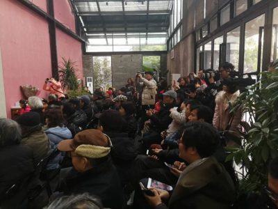 挨拶が終わると掲示されていた展示会のパネルに参加者が集まりサインを開始。中国では展示会のパネルに参加者が我先にとサインをしているのをよく見かけます。