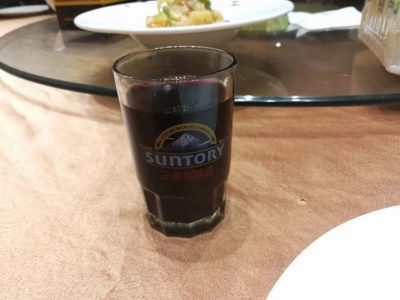 絵画関係と友人、朱先生のお弟子さんが集まる食事会だったのですが、お昼は白酒だったので今回はワインを飲むことに。中国あるある、ワイングラスではなく普通のコップで頂くワイン。そしてグラスの柄はサントリービール。