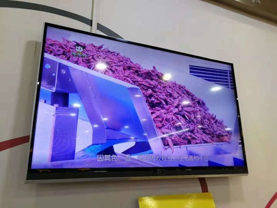 また製造される模様が液晶画面で紹介されていたのが手羽先の製造工程の動画。「どんだけ大量の鴨を使ってるんだ」というほどの量が加工製造されていました。