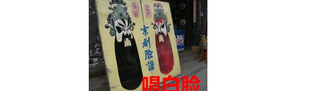 バックパック旅行で訪れた、山西省の世界遺産の街「平遥古城(Píng yáo Gǔ chéng)」にあった京劇看板。白い顔と赤い顔の京劇のお面が描かれていました。