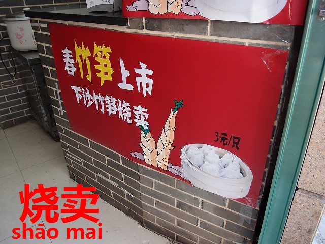 陽松芳米皮に置いてある、焼売。店先全面に焼売の告知が。