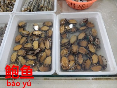 それはコレ、アワビ。ちょっと小ぶりでアワビというより、日本で言うトコブシなのかも知れませんが、貝屋の旦那は、「鲍鱼(bào yú)アワビ」と言って販売。