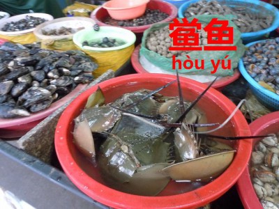 この舟山の市場で見かけた「カブトガニ」は、貝と同じ並びで桶の中に入れられていたり、